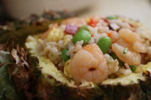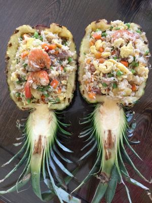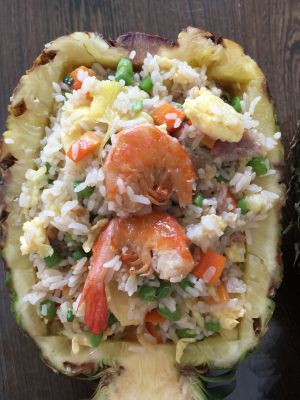 香葱爆锅,虾仁青豆香菇红椒分别入锅炒熟加米饭,不停翻炒,少许生抽,加鸡蛋。最后加菠萝肉。