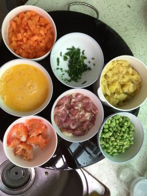 把等下要用到的材料备好!鸡蛋打散,胡萝卜切小块,猪肉切好放点油盐酱油腌一下,豆角切小粒,菠萝肉,葱花,几个虾干!等下下锅炒的时候先炒鸡蛋,炒至七分熟就装起来,然后就是炒肉跟胡萝卜(因为这两个比较难熟,等肉跟萝卜八成熟了就放豆角,虾干,刚才装起来的鸡蛋,菠萝,再放冷饭,调味好了之后最好撒上葱花就可以上过锅啦。✌️