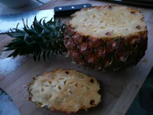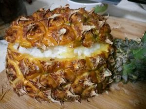 菠萝切开 用刀或薄的不锈钢勺子挖空