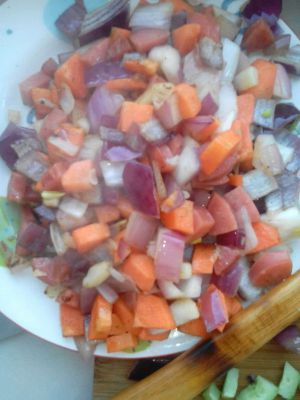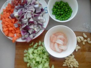 豌豆滚水过两分钟,胡萝卜洋葱黄瓜切大块,虾仁解冻后挑虾线,腰果最好小火炒一下,不炒也行,再切点蒜