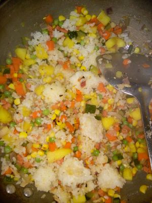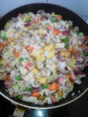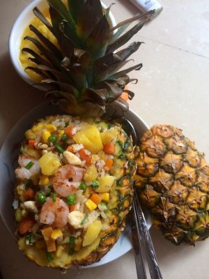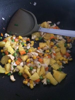 先炒鸡蛋,可以多倒点油,然后倒饭,最后加入蔬菜们,同时做菠萝盏,多余的菠萝切块一起炒饭,加入适合自己的调料