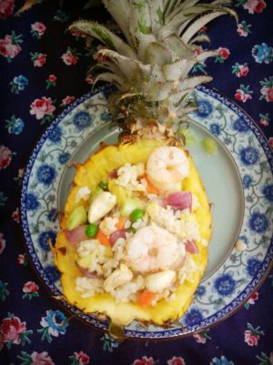 将拌匀米饭装入切成半边的菠萝里,表层再放一层菠萝。