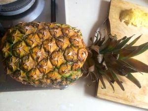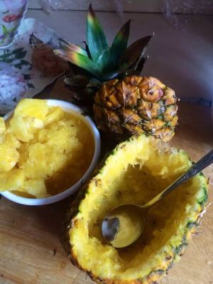 菠萝切开,挖出里面的果肉,放一边待用(这张图片是当时人多,竖破开的,用了一个菠萝)。