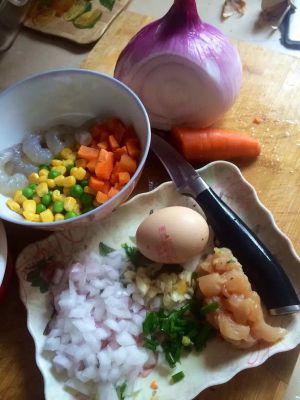 鸡蛋炒熟,洋葱切碎,胡萝卜切小丁,