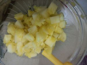 把水倒掉,加入切好的菠萝块儿和白糖,翻拌均匀。