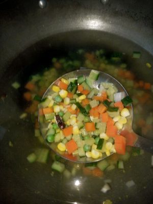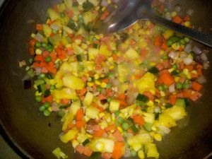 紧接着,煮好的玉米青豆胡萝卜丁和青瓜也下油锅啦,炒一小会儿