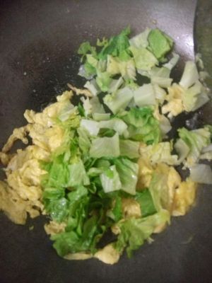 鸡蛋熟了就倒入生菜叶,小炒一会儿至6分熟就好,因为最后还要放菠萝皮里面蒸
