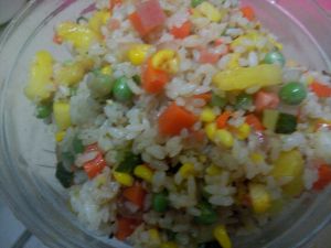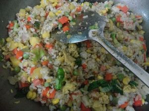 把之前炒好的五彩饭和鸡蛋青菜一起翻炒均匀即可