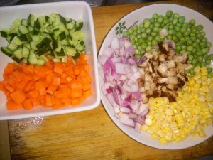 胡萝卜,黄瓜,洋葱和香菇切丁,玉米粒用菜刀滚下来,青豆也清洗好,五彩缤纷,颜色美美的不要不要的