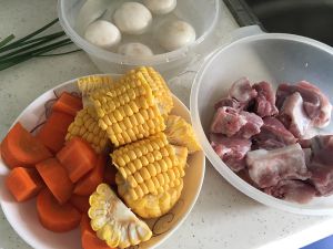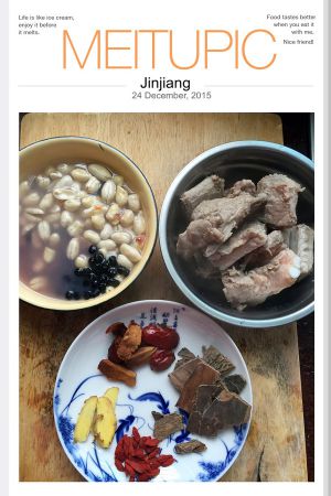 1.准备好所有原材料 2.排骨飞水下 3.花生和黑豆浸泡