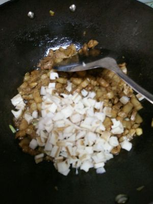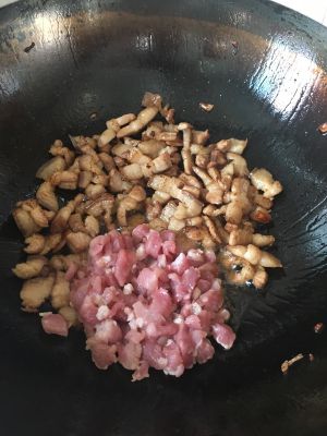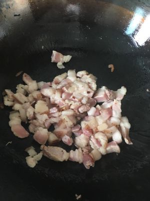 五花肉先放进去炒制,不喜欢太肥的可多炒一会,然后放入藕丁