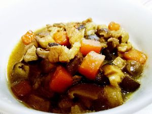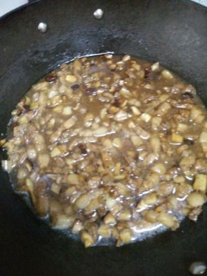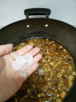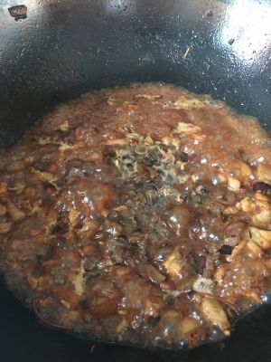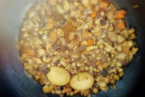 往锅里加入适量的香菇水和洋葱酥,大火开后转小火焖30分钟