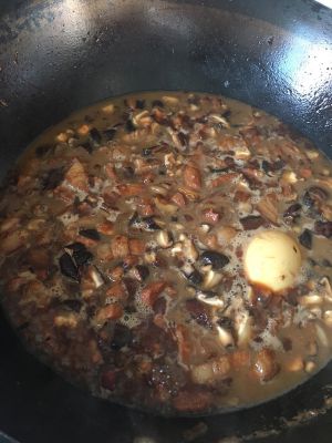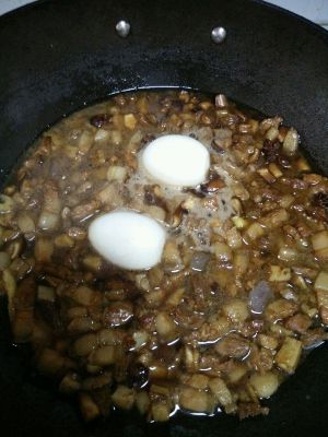 肉入味变软之后,加入香菇碎和一颗白水蛋
