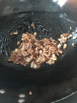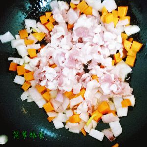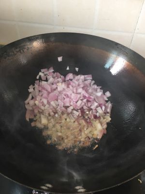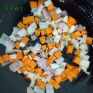 锅里放油七成热是放入姜丝稍微爆香,导入胡萝卜洋葱丁翻炒