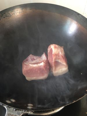 五花肉就切这样的小块。。。 然后把五花肉放过锅里煸炒,这个时候啥调料也不要放哦。。。这个叫去油。。。 吃起来才不油腻呀。。。