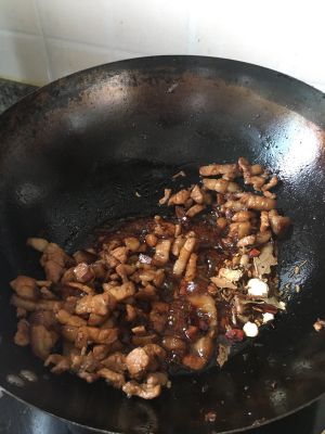 把锅里多余的油倒出来,偶中午拿这个猪油来拌空心菜哦。。。香香啊。。。 然后把猪皮,还有这些配料通通丢进去翻炒,漂亮吧,五颜六色的。。。哈哈哈