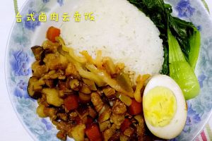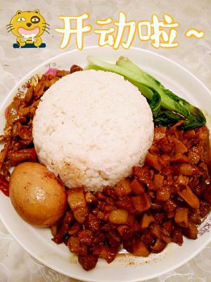 卤蛋对半切开,在饭边上摆上青菜 浇上卤肉(一定要带卤肉汁) 摆上榨菜 半个卤蛋