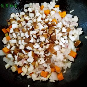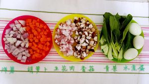 五花肉 香菇 胡萝卜 洋葱切1CM左右的菜丁和肉丁 鸡蛋清水煮熟去壳 青菜洗净备用