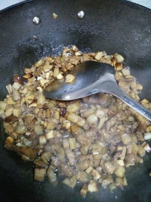 闻到洋葱的香味时倒入五花肉丁继续翻炒,一定要肥瘦相间的五花肉,才能做出美味的卤肉饭哦!