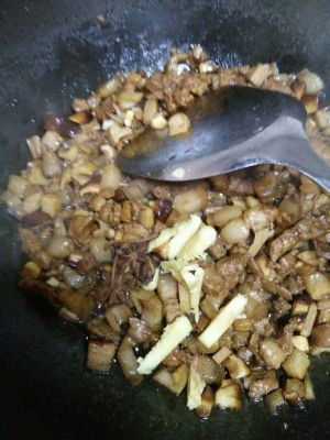 加入香菇翻炒一分钟左右,加入开水,剥过壳的鸡蛋,盐 十三香 老抽 生抽 料酒 香叶 肉桂 姜片 冰糖 水一定要盖过食材。烧开后,中小火慢炖30分钟。