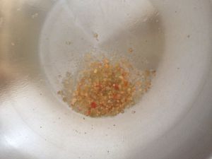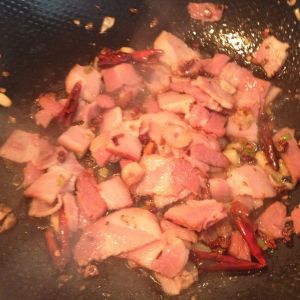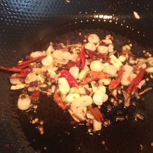 油锅热后先下入掰碎的干辣椒和麻椒炒出香味,快速下入蒜片翻炒,再放入葱末煸炒均匀。