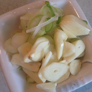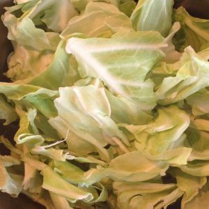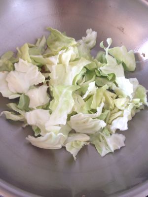 圆白菜手撕成片,用盐水净泡20分钟后沥干水份备用。