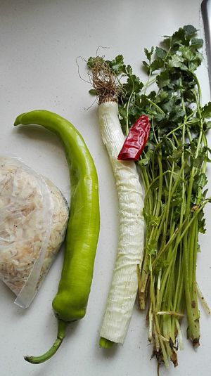 将香菜、尖椒、黄瓜洗净切丝