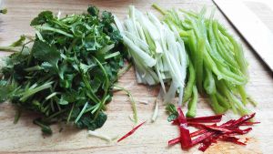 青菜洗净,尖椒切细丝、葱白切细丝、香菜切与葱白差不多长短的段,红椒切细丝;