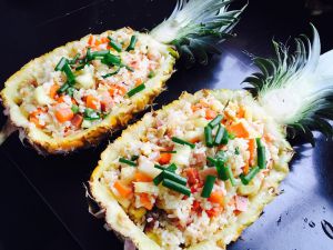 炒好的米饭盛入菠萝盅,摆盘。就这么简单。