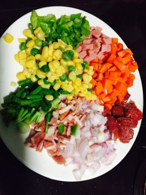把食材都切成丁,会吃辣可以加青椒哦~ 培根可以换做虾仁都可以的