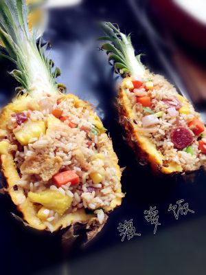 把菠萝挖空备用,里面的菠萝切丁,备用 然后锅烧热倒入食用油,然后依次放入葱白,洋葱,等香味出来了再依次放入火腿,培根,胡萝卜,玉米青豆,在炒de时候倒掉老酒提香哦