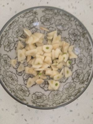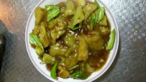 蒜瓣里的一半炝锅,虾仁放入煸熟,放入煸好的茄子,放甜面酱,盐,适量糖,放剩下的蒜瓣出锅