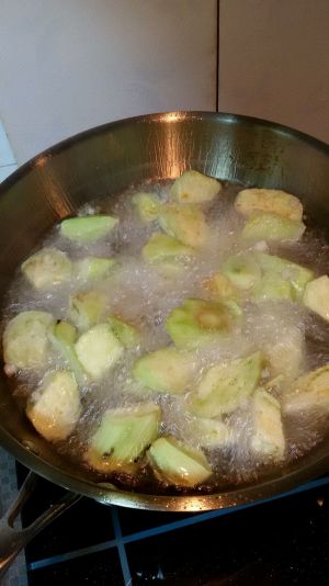 茄子洗净,去皮,切菱形块,用水浸泡5分钟,把水倒出。取干淀粉适量,倒入小盆中,茄子沾满淀粉。油锅烧开,沾好淀粉的茄子下锅,炸至变黄色且表面变硬,捞出备用。