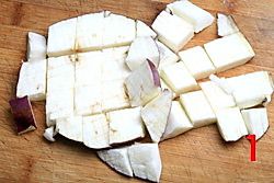 茄子洗净,(千万别去皮,茄子皮中的营养可是相当丰富,尤其补铁呢)切成大片后在上面轻轻切成小细格但不切断后在将大片切成块用盐沙一下(这样烧出的茄子入味)。