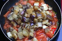 再放入煸好的茄子丁一起煸炒,加一点白糖,盐调味。