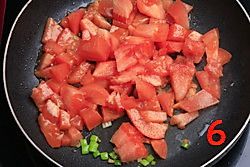 锅内做油煸香葱花放入西红柿粒,煸炒出红油。