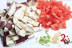将茄子切滚刀块后放入盆中加盐待用(切小滚刀块) 西红柿切块 彩椒切片 小葱切末,蒜切末。