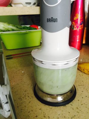 将冲好的米粉一起到入搅拌机里,这样里面稀一点会比较好打碎,菜和米粉融合的也比较好!