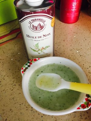 最后倒入一滴核桃油,核桃有补肾固精、利尿消石、润肠通便、温肺定喘的作用。山药搭配核桃食用,具有补中益气、强筋壮骨、健脑的作用,既补充了营养又增加了香度!宝宝很爱吃