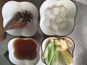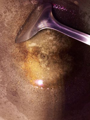 热锅少量冷油,下敲碎的冰糖,小火加热至冰糖融化颜色变褐色,冒泡!