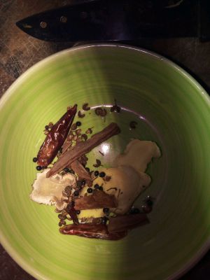 放葱,姜片,辣椒,花椒,桂皮,大料,继续炒