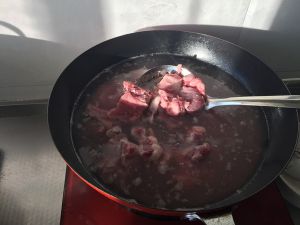 5.加清水没过排骨,加姜片、大葱段、适量黄酒、少许酱油、鸡蛋焖煮。