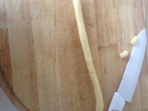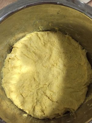鸡蛋打匀 加入奶粉 加入软化后的黄油 打匀 加色拉油 筛入所有混合粉 揉成面团。搓成长条