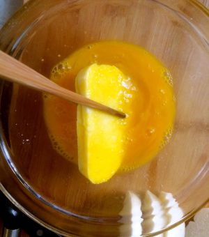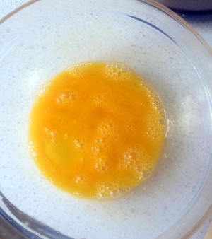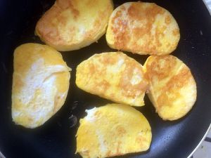 把馒头片放入蛋液,使蛋液均匀裹住馒头片,然后放入锅中