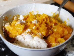 再把面粉倒进盆里,一起混合均匀。南瓜泥蒸熟以后水份含量还是挺高的,所以我这里没有加水,只是用南瓜泥里的水分和面粉融合在一起。
