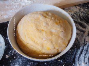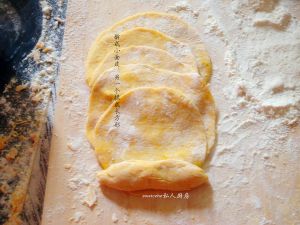 将黄色面团切割成小剂子(大约40克一个),留15克备用。取其中一个黄色面团,按扁,用擀面杖擀成圆形。