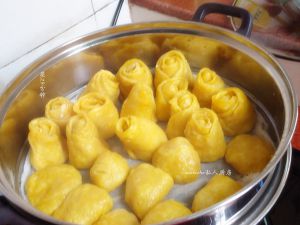 出锅喽。怎么样,是不是很美丽呢?这么好看的花朵馒头,小朋友们一定会喜欢吧!