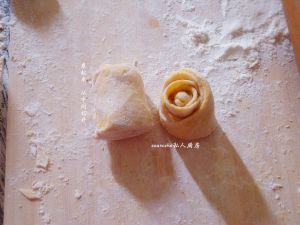 把长长条放中间,然后卷起来,一定要把面皮贴紧,然后很结实的卷卷卷;用刀从中间切开,就是二个馒头。