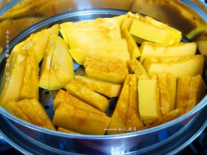 南瓜去皮、去瓤、去籽,切块,洗干净,放在蒸锅中蒸熟;PS:照片蒸熟的南瓜不止500克,我一起蒸熟用于做炸馒头丸子。