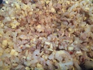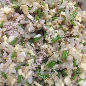 切好的猪肉,剁碎,冬笋切粒,笋干泡发开水稍煮,然后也切小粒,萝卜刨成丝,焯水捞出剁碎。